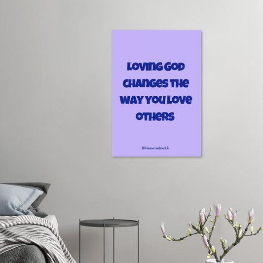 Inspirational Christian Poster - 'Loving God Changes the Way You Love Others' in Purple and Blue